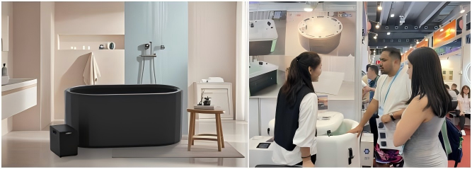 卫浴展位推出定制颜色亚克力浴缸,这些浴缸不仅外观更加现代时尚,还可兼具按摩、温泉浴等水疗功能,材质性能均处于行业先进。还有首次亮相的外置制冷机,能快速将水温降至冰浴温度,助力运动后肌肉恢复,实现 “居家冰爽 SPA”,展前已邀请利比亚客户到会场参观展品并沟通后续合作。