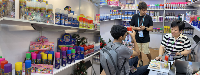 节日用品展位持续上线热门产品飞雪和彩带,并针对欧洲市场标准调整了飞雪喷雾罐配方,为打开欧洲市场奠定基础。在展会现场成功签订了2张订单并收取了部分订金。