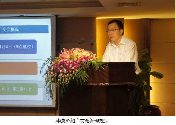 集团广交会总带队李伟全副总经理向全体参展代表宣布了第112届广交会的基本情况和管理规定,从广交会概况、我集团展位情况、展位特装、广州交易团展位使用管理办法、证件管理、成交指标、展位使用建议、知识产权管理、筹撤展、国内外经济形势十个方面做了介绍和提出要求。