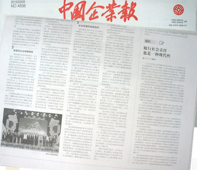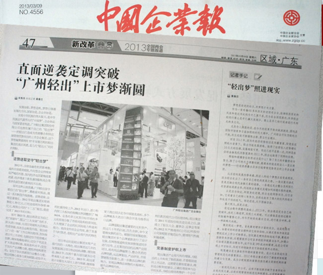 2013年3月9日,中国企业报在全国两会专题报道版面整版刊登了关于“轻出梦”的文章《直面逆袭定调突破 “广州轻出”上市梦渐圆》。