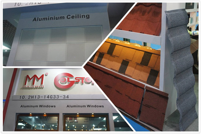 建材展位通过整合资源,突出展示了铝型材和铝制品,形成铝合金天花、铝合金门窗、镀铝锌板的彩石金属瓦三大系列,体现出经营的专业性。