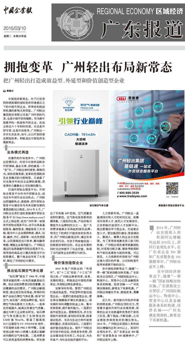 两会期间,《中国企业报》刊登文章:“拥抱变革 广州轻出布局新常态”,对我司新产品、新模式、新理念进行报道。