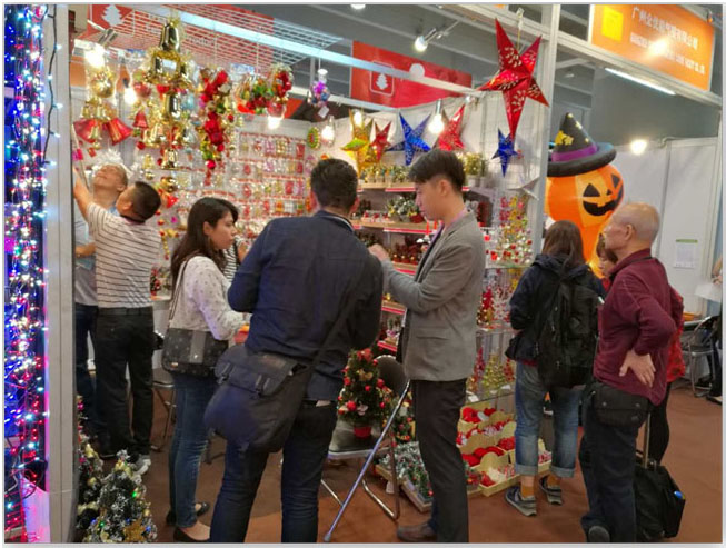 节日用品展位——五矿公司的节日产品采用全国领先的注塑工艺,打造出了全国最大的圣诞铃注塑模具,直径近40cm;装饰物更是少见的纯手工打磨,更精细、更耐用,受到日韩、俄罗斯及欧洲采购商的热烈追捧。