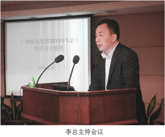 2011年3月21日上午,广州轻出集团有限公司召开2011年1-2月经济运行情况通报会,集团全体中层副职以上领导参加了会议。