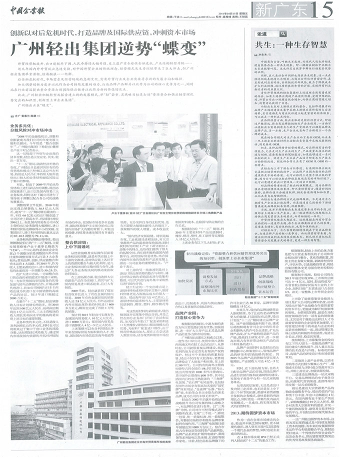 4月15日出版的《中国企业报》以一整版篇幅发表了题为《广州轻出集团逆势“蝶变”》的文章,对我司创新以对后危机时代,积极进行转型及探索建立新的发展模式表示关注。