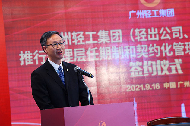 9月16日上午,广州轻工集团在轻工大楼5楼会议室举行轻出公司、三角公司推行经理层任期制和契约化管理(职业经理人)签约仪式。集团公司党委书记、董事长曾郴湘出席并作重要讲话。会议由集团公司党委副书记、副董事长、总经理林虎主持,广州轻工集团相关管理人员、轻出公司和三角公司领导班子及中层以上管理人员出席了会议。