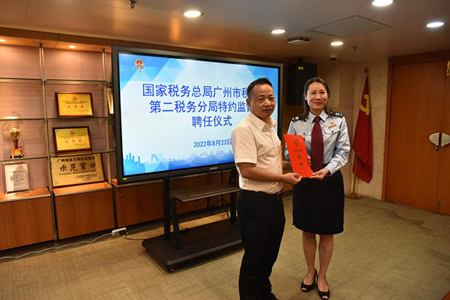 8月23日,国家税务总局广州市税务局第二分局举行特约监督员聘任仪式,陈志清局长等领导出席会议,广州轻工集团轻出公司总会计师张建新等五位特约监督员正式上任。陈志清局长向特约监督员颁发了聘书并提出三点期望:一是税企合力共建廉洁社会文化,二是上传下达发挥桥梁纽带作用,三是不遗余力当好税务宣传员。
