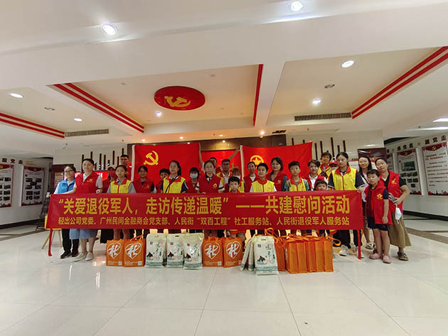 为推动主题教育走深走实,进一步弘扬拥军优属的光荣传统,营造爱国拥军的浓厚氛围。8月15日,广州轻出集团股份有限公司党委(以下简称轻出公司党委)联合人民街“双百工程”社工服务站、广州民间金融商会党支部和人民街退伍军人服务站共同开展“关爱退伍军人,走访传递温暖”——共建慰问活动,链接整合广州民间金融商会党支部的资源,联动轻出公司党员团员志愿者、社区志愿者和少先队员共同走进人民街退伍军人家庭,为社区退伍军人送上关心和问候。