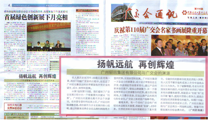 10月16日,广交会通讯在第4版刊登了题为《扬帆远航,再创辉煌——广州轻出集团有限公司与广交会的渊源》的专题报道,以“创新”和“发展”为关键词概括了我司与广交会55年来共同成长、转型和蜕变的历程,寄望企业与广交会一同再度扬帆,向可持续发展的目标奋进。