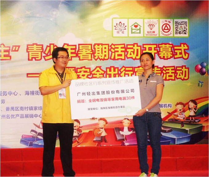 2014年7月19日,由广州名优产品展销中心等单位举办的“名优品牌社区行”活动,携手我司走进海珠区海幢街。我司向海幢街献爱心捐赠了三角牌电饭锅、电热水壶、酸奶机等家电一批,给社区居民带去生活关怀。