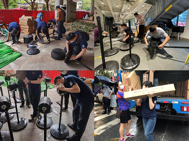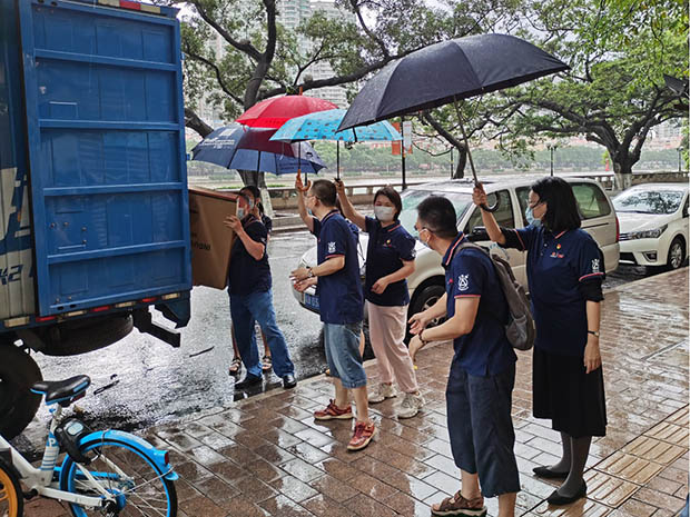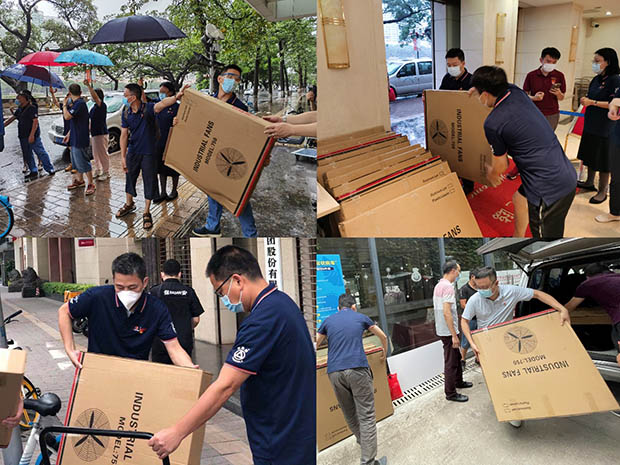 显担当。一方面,轻出公司以实际行动践行“我为群众办实事”的责任担当,充分利用“钻石牌”品牌优势,在面对这场突如其来的硬仗,发挥自身优势,冲锋在前,多措并举,捐赠物资,做好保障,助力打赢这场没有硝烟的战争。这也是轻出公司开展党史学习教育以来,切实将党史学习成果,转化为勇担国企责任、动力和成效的有力佐证。另一方面,在人力、物力都齐全的基础上,轻出公司组建5支志愿者服务队,计划分别前往番禺区、天河区、越秀区、海珠区等各大核酸检测点。5月29日下午2时许,广州市内暴风骤雨袭来,江面翻起层层白浪。在珠江旁的轻出公司志愿者服务队正在陆续搬运捐赠物资,女同志纷纷给男同志打伞,男同志负责搬运。最终在当天下午7时许,在最短的时间内,顺利将风扇捐赠至各大核酸检测点,其中捐赠至番禺区丽江花园检测点50台,不断提升企业形象,彰显国企正能量。