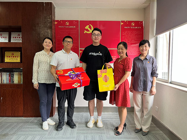 凝心聚力抗疫情,一线慰问暖人心。9月5日下午,由轻出公司党委副书记杨珍带队慰问了借调至广州市防控办陆空口岸专班人员陈文正,送上公司党委殷切的关怀、中秋的祝福,感谢他主动请缨奔赴疫情防控工作前线、抗击疫情,体现了轻出青年不惧风险、勇于担当、甘于奉献的无私精神,并为他送上了丰富的节日慰问品。杨书记请陈文正同志在抗疫一线安心工作,并叮嘱他注意个人防护安全,高质量完成疫情防控工作。